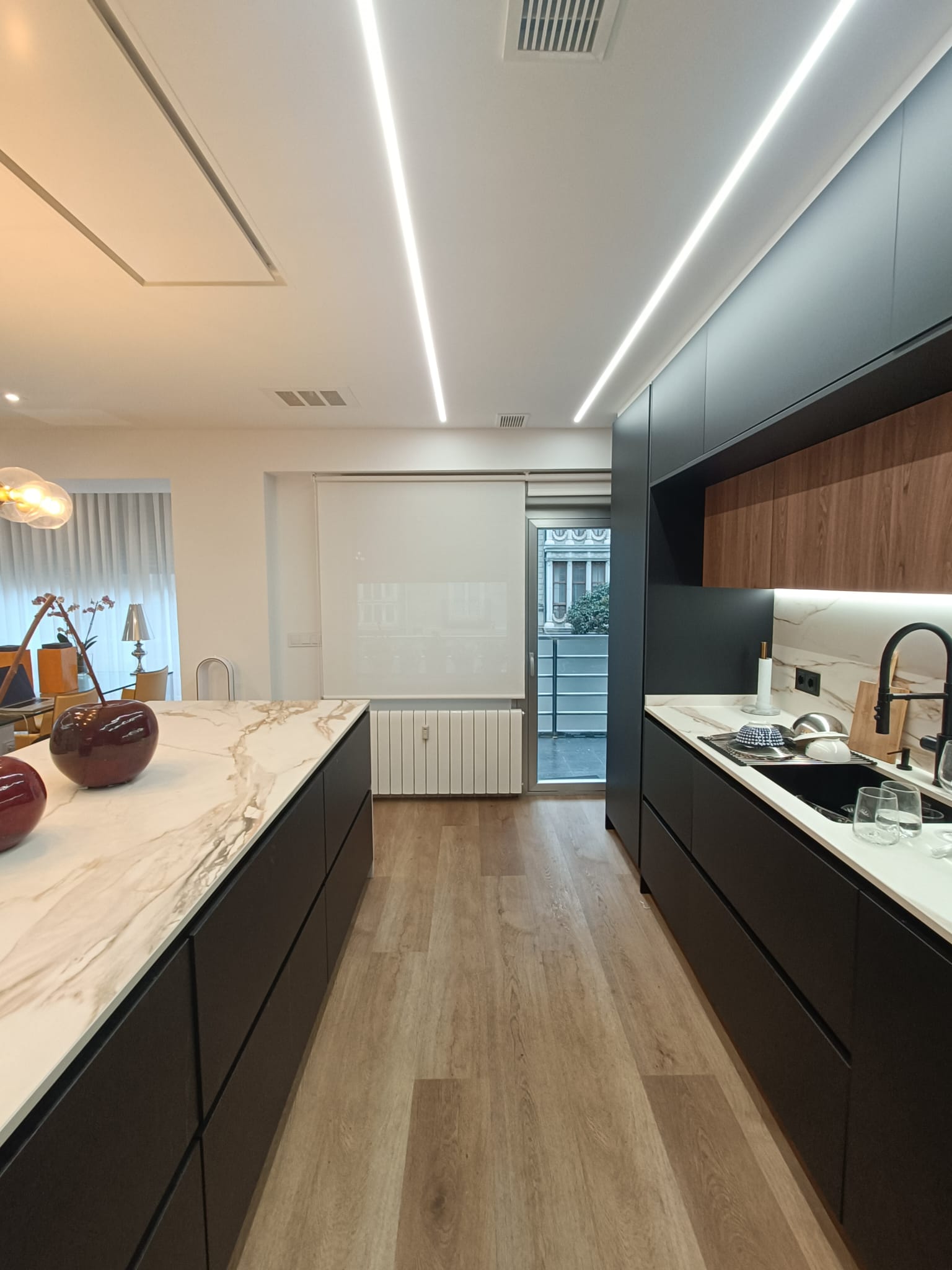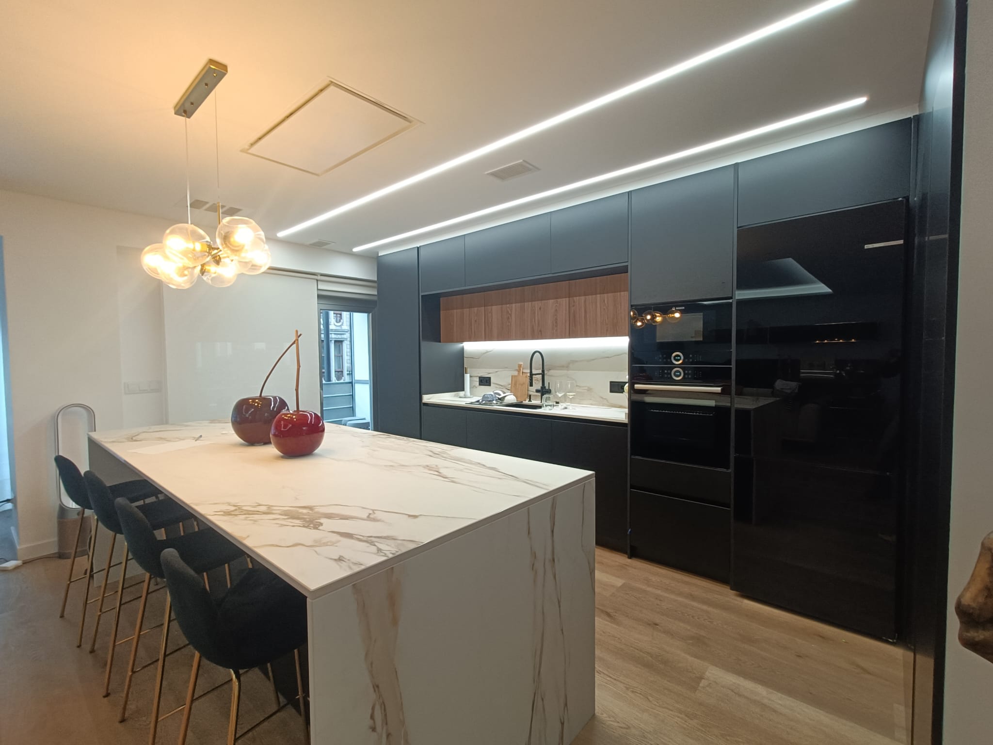 Cocina moderna de diseño elegante y sofisticado, protagonizada por una paleta en color negro que aporta carácter y distinción al espacio. Cuenta con muebles altos tipo puente que optimizan al máximo la capacidad de almacenamiento, integrándose de forma armónica y funcional. La encimera ABK, con vitrocerámica integrada, presenta un acabado efecto mármol que combina estética y resistencia, aportando un toque de lujo contemporáneo. Los muebles de remate han sido realizados a medida, garantizando un ajuste perfecto, continuidad visual y un aprovechamiento óptimo del espacio, logrando un conjunto equilibrado, práctico y de alta calidad estética.